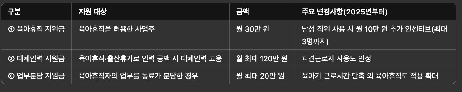2025년부터는 정부의 육아휴직 관련 사업주 지원금 제도가 훨씬 강화되었습니다.