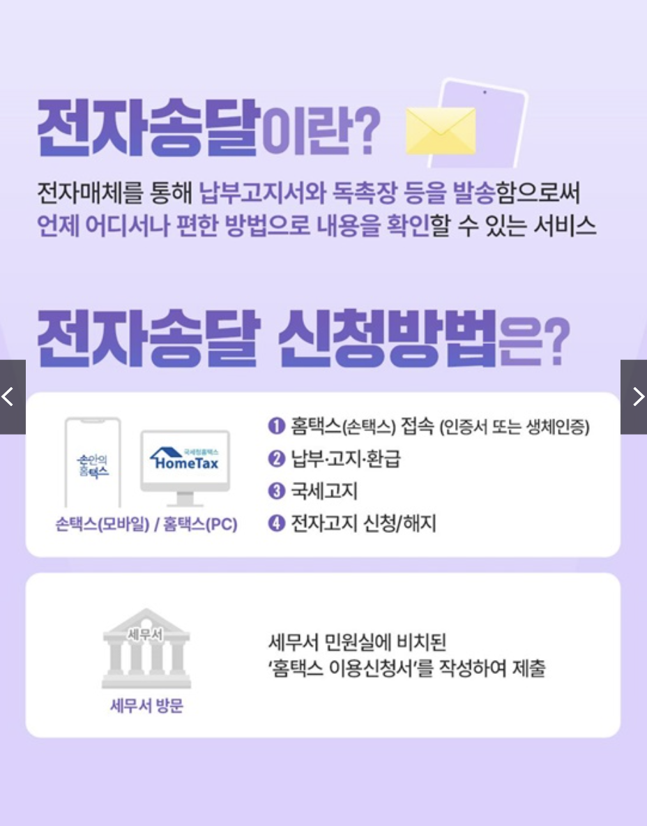 • 전자고지를 받았더라도 납부는 홈택스, 카드납부, 계좌이체 등 기존 방식과 동일하게 가능합니다.